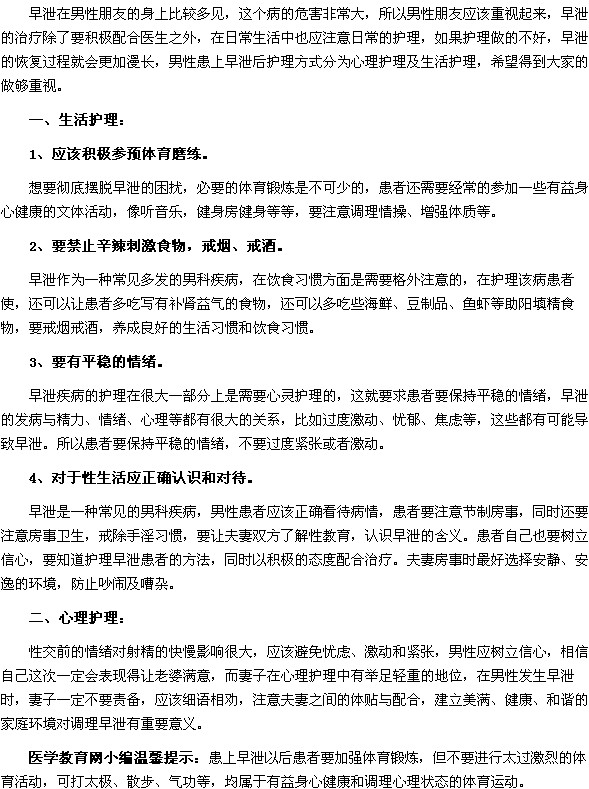 通過對(duì)以上內(nèi)容的閱讀,相信大家對(duì)患上早泄的生活護(hù)理及心理護(hù)理方法已經(jīng)有所了解,男性早泄對(duì)身體及心理的影響非常大,男性朋友應(yīng)該重視起來,積極配合醫(yī)生治療,做好生活及心理的護(hù)理,希望早泄患者朋友能夠早日康復(fù)。