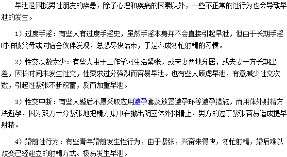以上就是關于“會導致早泄發(fā)生的不正常性行為”的相關內(nèi)容,通過對上述文章的介紹,相信大家已經(jīng)有所了解,希望能夠幫助到大家,更多沒人請繼續(xù)關注醫(yī)學教育網(wǎng)。