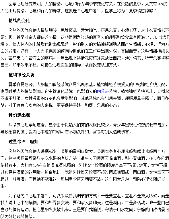 相信很多人會對人的情緒變化會導致出現(xiàn)心理中暑的情況的內(nèi)容比較感興趣,為此,醫(yī)學教育網(wǎng)編輯特地為您準備了這篇關于人的情緒變化會導致出現(xiàn)心理中暑的情況的文章,希望對您有幫助。