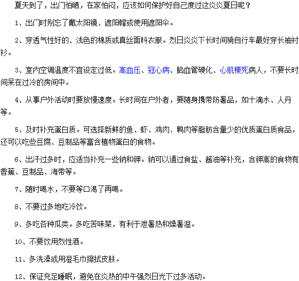 夏天就要到了,相信很多人都想知道夏天預(yù)防中暑的十二項(xiàng)保護(hù)措施是什么,醫(yī)學(xué)教育網(wǎng)編輯為您搜集整理了夏天預(yù)防中暑的十二項(xiàng)保護(hù)措施的具體內(nèi)容分享給大家。