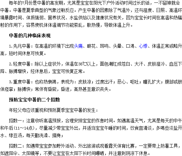 相信很多人都想知道寶寶中暑的應急處理措施及處理的誤區(qū)是什么?下面請大家仔細閱讀醫(yī)學教育網(wǎng)編輯專門為您整理的寶寶中暑的應急處理措施及處理的誤區(qū)這篇文章吧。