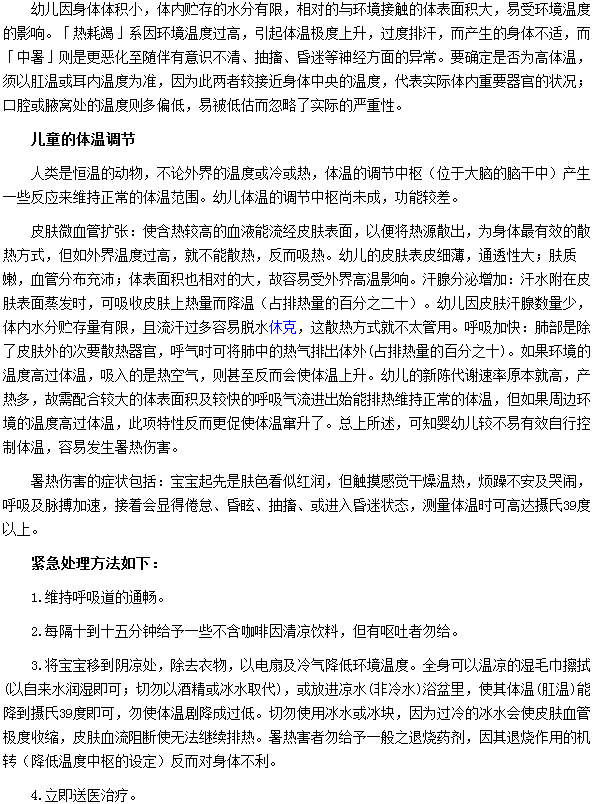 相信很多家長(zhǎng)朋友一定會(huì)對(duì)幼兒中暑的預(yù)防及緊急處理方法很感興趣,下面就請(qǐng)各位家長(zhǎng)朋友仔細(xì)閱讀這篇關(guān)于幼兒中暑的預(yù)防及緊急處理方法的文章,希望對(duì)大家有幫助。