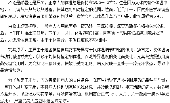 精神病患者服用某些藥物會(huì)導(dǎo)致中暑,相信很多人都不知道,那么精神病患者服用哪些藥物會(huì)導(dǎo)致中暑呢?相信大家看了下面這篇文章就會(huì)明白了。