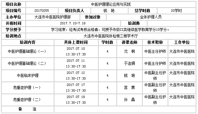 根據(jù)《關(guān)于公布2017年大連市繼續(xù)醫(yī)學(xué)教育項(xiàng)目的通知》(大繼委發(fā)〔2017〕3號)精神,《中醫(yī)護(hù)理理論應(yīng)用與實(shí)踐》學(xué)習(xí)班擬于7月10日開班。具體安排如下: