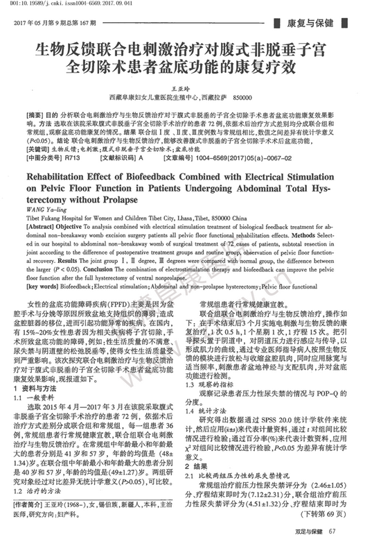 今日,西藏阜康醫(yī)院發(fā)布了“生物反饋聯(lián)合電剌激治療對(duì)腹式非脫垂子宮全切除術(shù)患者盆底功能的康復(fù)療效”的動(dòng)態(tài),具體內(nèi)容如下,請(qǐng)查看!