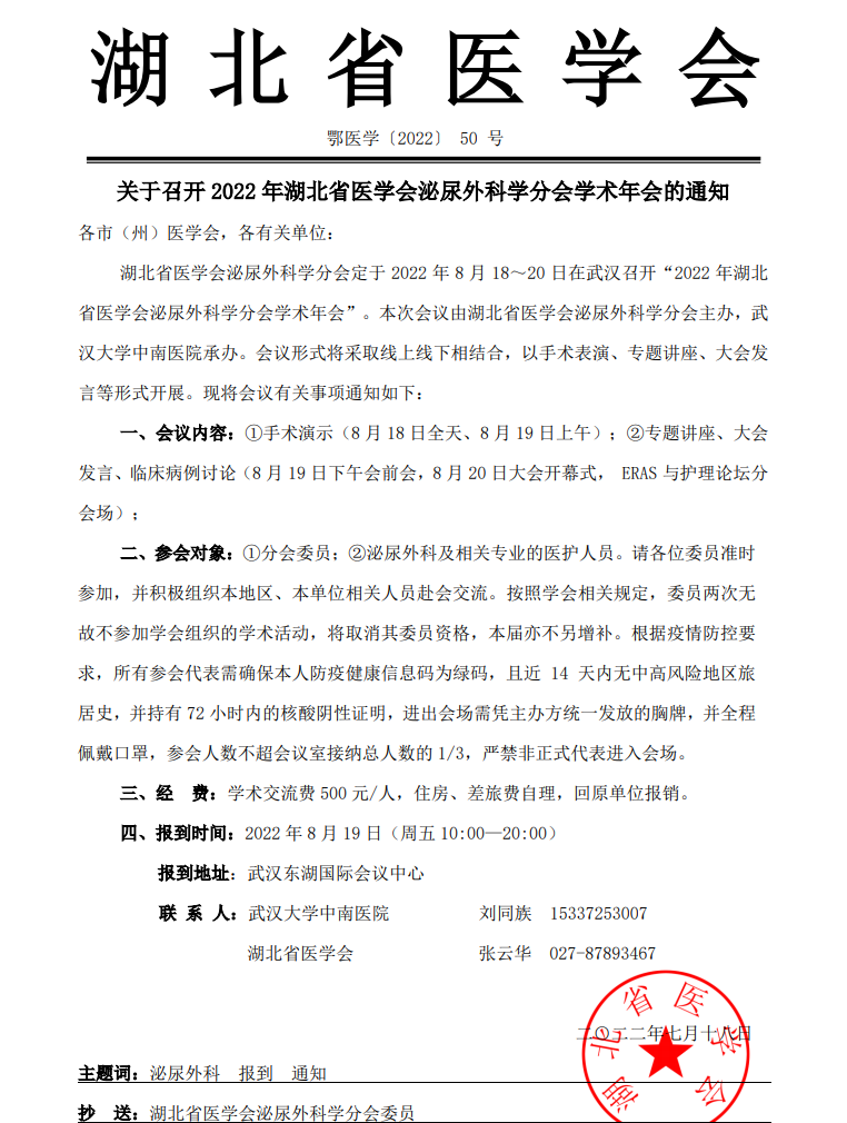 以上就是小編為大家整理的關于召開2022年湖北省醫(yī)學會泌尿外科學分會學術年會的通,想了解更多有關繼續(xù)醫(yī)學教育、考試培訓等相關優(yōu)質資訊還請多多關注醫(yī)學教育網(wǎng)!