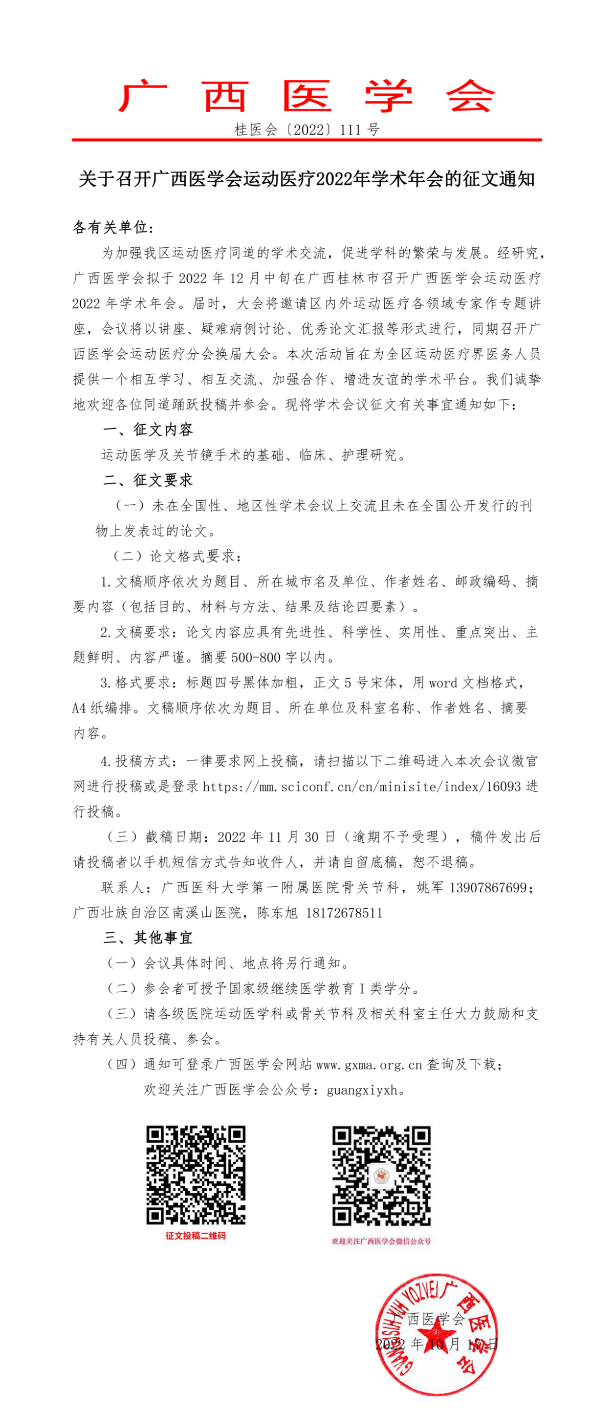以上就是小編為大家整理的關(guān)于召開廣西醫(yī)學(xué)會運動醫(yī)療2022年學(xué)術(shù)年會的征文通知,想了解更多有關(guān)繼續(xù)醫(yī)學(xué)教育、考試培訓(xùn)等相關(guān)優(yōu)質(zhì)資訊還請多多關(guān)注醫(yī)學(xué)教育網(wǎng)!