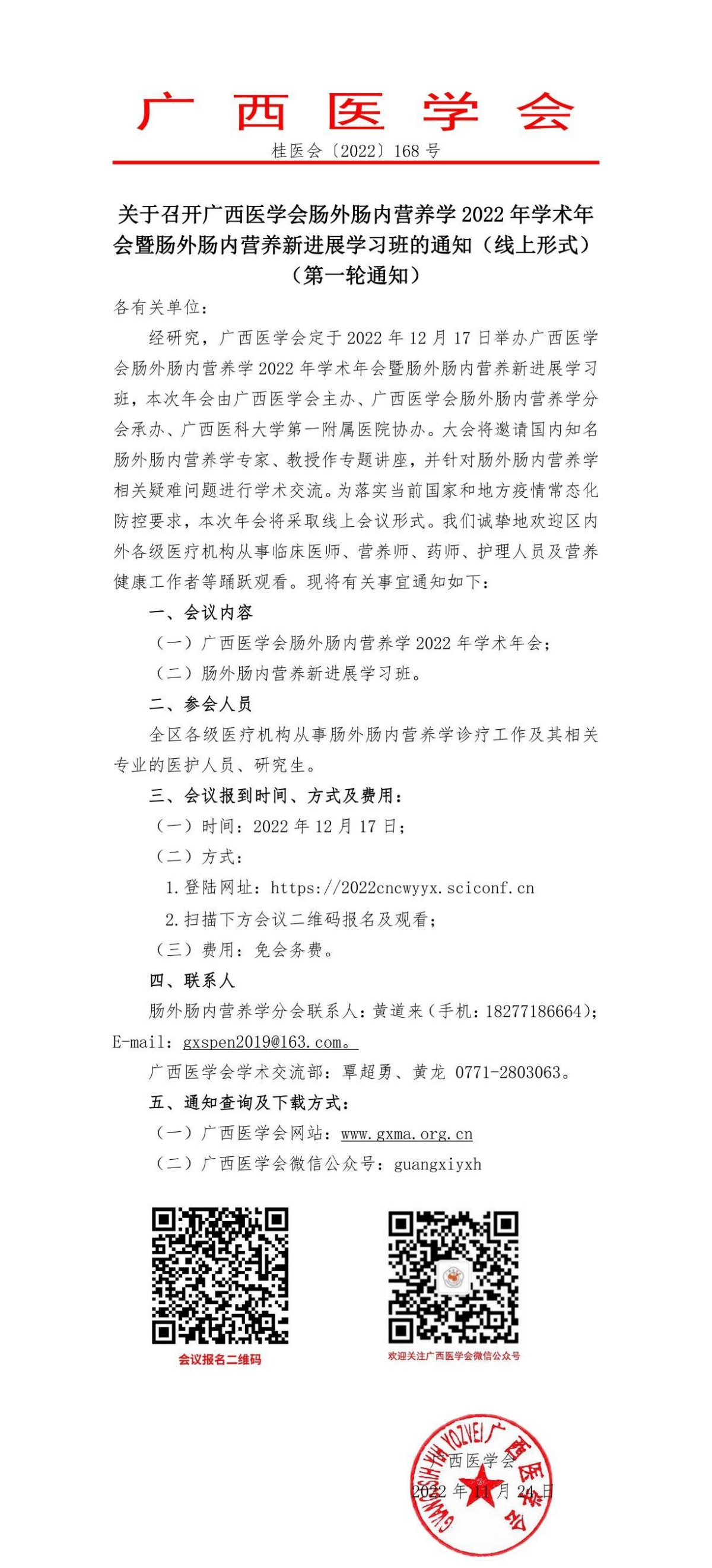 以上就是小編為大家整理的關(guān)于召開(kāi)廣西醫(yī)學(xué)會(huì)腸外腸內(nèi)營(yíng)養(yǎng)學(xué)2022年學(xué)術(shù)年會(huì)暨腸外腸內(nèi)營(yíng)養(yǎng)新進(jìn)展學(xué)習(xí)班的通知(線上形式)(第一輪通知),想了解更多有關(guān)繼續(xù)醫(yī)學(xué)教育、考試培訓(xùn)等相關(guān)優(yōu)質(zhì)資訊還請(qǐng)多多關(guān)注醫(yī)學(xué)教育網(wǎng)!