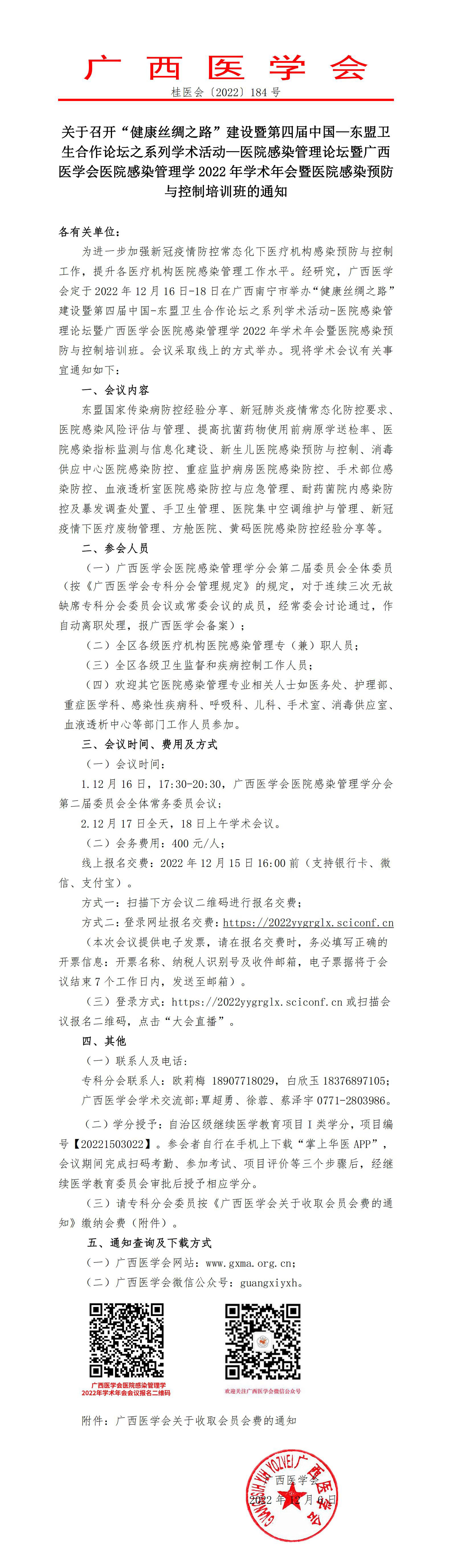 以上就是小編為大家整理的關(guān)于召開“健康絲綢之路”建設(shè)暨第四屆中國—東盟衛(wèi)生合作論壇之系列學(xué)術(shù)活動—醫(yī)院感染管理論壇暨廣西醫(yī)學(xué)會醫(yī)院感染管理學(xué)2022年學(xué)術(shù)年會暨醫(yī)院感染預(yù)防與控制培訓(xùn)班的通知,想了解更多有關(guān)繼續(xù)醫(yī)學(xué)教育、考試培訓(xùn)等相關(guān)優(yōu)質(zhì)資訊還請多多關(guān)注醫(yī)學(xué)教育網(wǎng)!