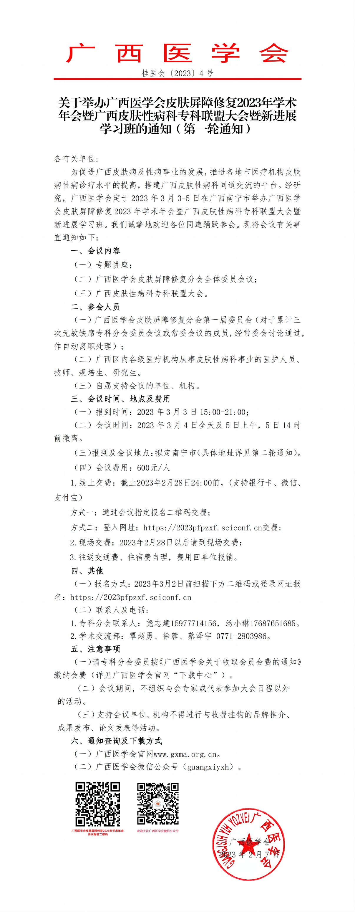 以上就是小編為大家整理的關(guān)于舉辦廣西醫(yī)學會皮膚屏障修復(fù)2023年學術(shù)年會暨廣西皮膚性病科??坡?lián)盟大會暨新進展學習班的通知(第一輪通知),想了解更多有關(guān)繼續(xù)醫(yī)學教育、考試培訓(xùn)等相關(guān)優(yōu)質(zhì)資訊還請多多關(guān)注醫(yī)學教育網(wǎng)!