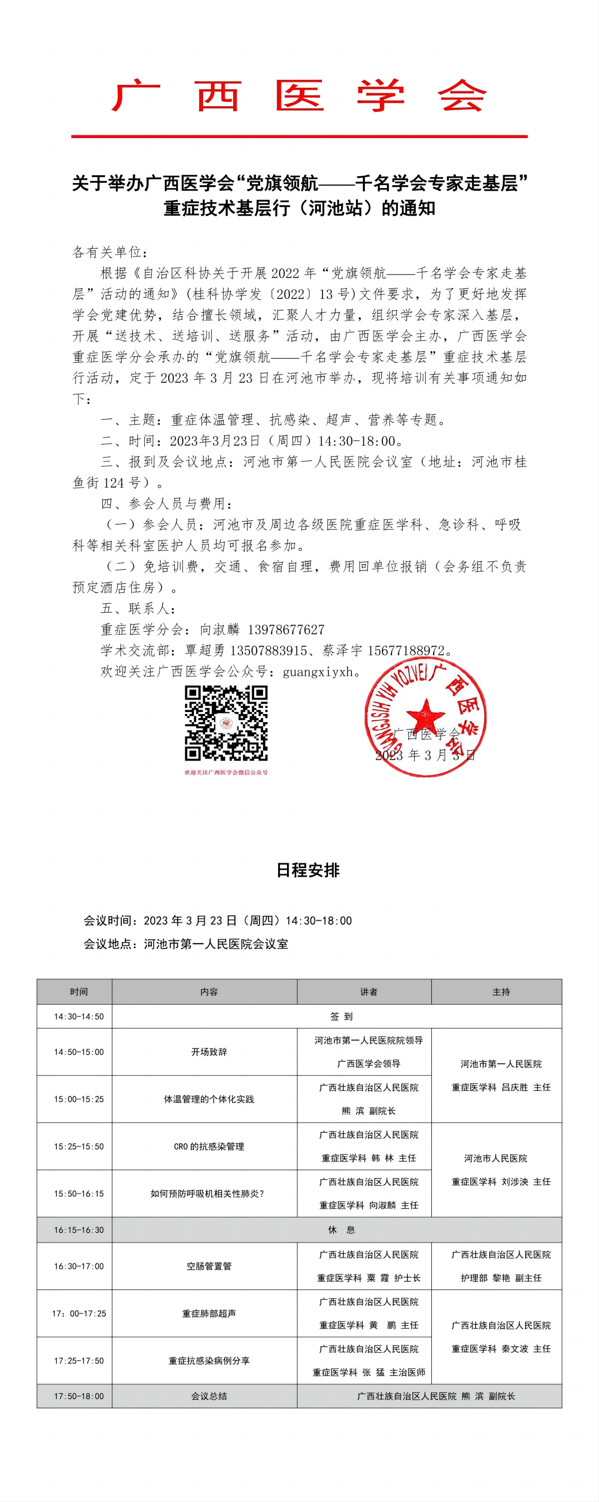 以上就是小編為大家整理的關(guān)于舉辦廣西醫(yī)學(xué)會(huì)“黨旗領(lǐng)航——千名學(xué)會(huì)專家走基層” 重癥技術(shù)基層行(河池站)的通知,想了解更多有關(guān)繼續(xù)醫(yī)學(xué)教育、考試培訓(xùn)等相關(guān)優(yōu)質(zhì)資訊還請(qǐng)多多關(guān)注醫(yī)學(xué)教育網(wǎng)!