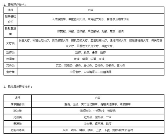 醫(yī)學(xué)教育網(wǎng)小編推薦大參加北京市成人按摩職業(yè)技能培訓(xùn)學(xué)校的康復(fù)理療師培訓(xùn),培訓(xùn)的價格可以與學(xué)校進(jìn)行咨詢,該校康復(fù)理療師的培訓(xùn)課程主要包括以下內(nèi)容,大家可以作為參考: