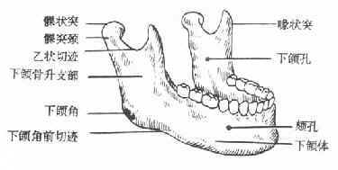 下頜骨分為體部及升支部,兩側(cè)體部在正中聯(lián)合。下頜升支部上方有兩個骨性突起,在后方者稱為髁狀突,在前方者稱為喙突(肌突),兩者之間的凹緣稱為乙狀切跡。升支部后緣與下頜骨下緣相交處稱為下頜角,升支部內(nèi)側(cè)面中部有一個孔稱下頜孔,此孔在下頜骨內(nèi)向下向前延伸的管道,稱下頜骨。下頜管在第一、第二前磨牙牙根之間向外穿出一孔,稱頦孔。下牙槽神經(jīng)、血管從下頜孔進入下頜管向前走行,在頦孔處分出頦神經(jīng)及血管。