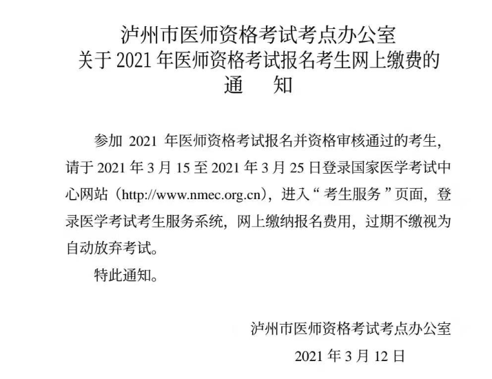 瀘州市2021年口腔執(zhí)業(yè)醫(yī)師資格考試網(wǎng)上繳費3月15日入口開通!