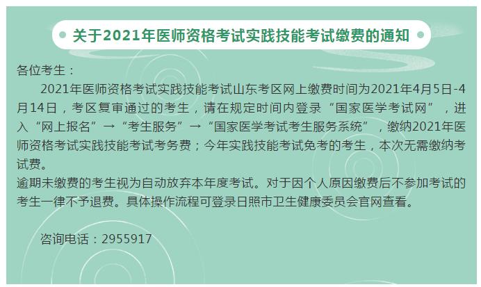 2021年醫(yī)師資格考試實踐技能考試山東考區(qū)網(wǎng)上繳費時間為2021年4月5日-4月14日,考區(qū)復(fù)審?fù)ㄟ^的考生,請在規(guī)定時間內(nèi)登錄“國家醫(yī)學(xué)考試網(wǎng)”,進入“網(wǎng)上報名”→“考生服務(wù)”→“國家醫(yī)學(xué)考試考生服務(wù)系統(tǒng)”,繳納2021年醫(yī)師資格考試實踐技能考試考務(wù)費;今年實踐技能考試免考的考生,本次無需繳納考試費。