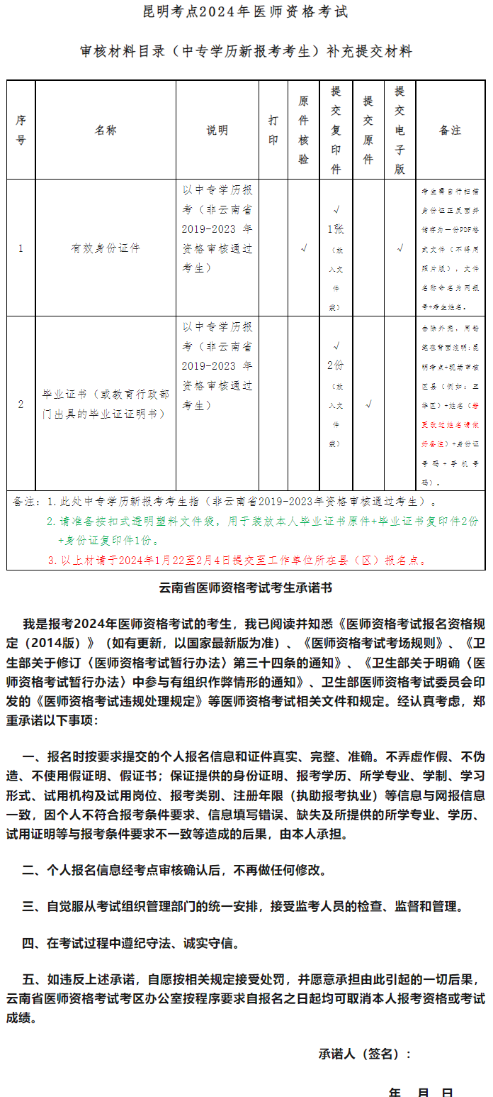 4.非云南省2019-2023年審核通過的中專學(xué)歷報(bào)考考生按照《昆明考點(diǎn)2024年醫(yī)師資格考試審核目錄(中專學(xué)歷新報(bào)考生)補(bǔ)充提交材料》(見附件)于2024年1月22至2月4日赴工作單位所轄縣(區(qū))報(bào)名點(diǎn)遞交畢業(yè)證書原件、身份證PDF電子版、畢業(yè)證復(fù)印件2份和身份證復(fù)印件1份,未按時(shí)遞交視為審核未通過。