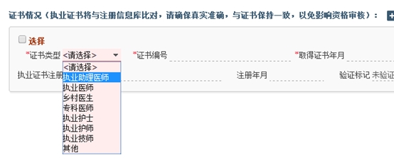 4、助理升執(zhí)業(yè)的考生,必須在下圖中選擇“執(zhí)業(yè)助理醫(yī)師”,證書(shū)編號(hào)即醫(yī)師資格證書(shū)編號(hào),所有信息準(zhǔn)確填寫(xiě)后,勾選左上角的“選擇”。