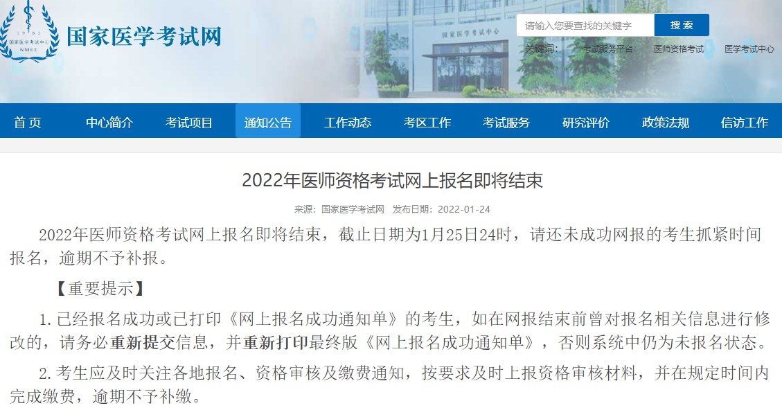 1月24日,國家醫(yī)學(xué)考試網(wǎng)發(fā)布了22醫(yī)師報(bào)名即將結(jié)束的通知。