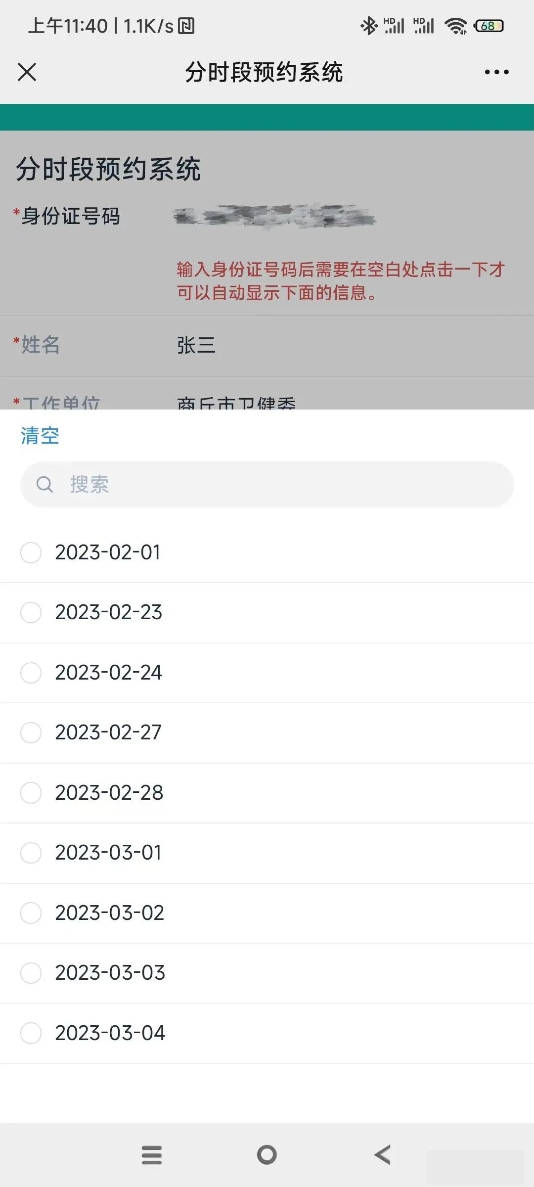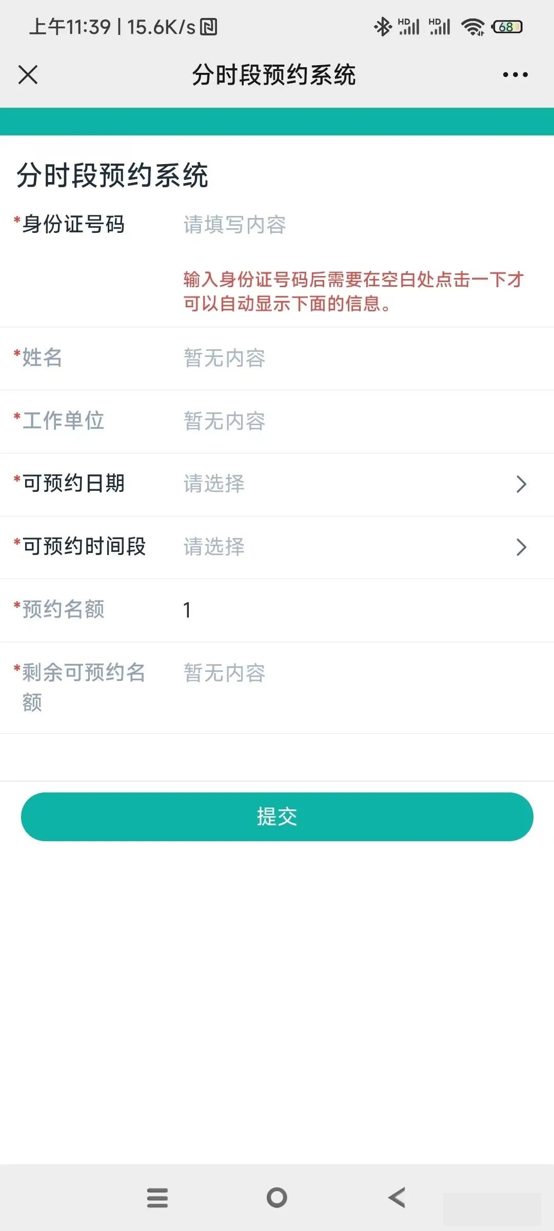 進(jìn)入預(yù)約系統(tǒng)后輸入正確的身份證號碼(最后一位為字母的應(yīng)為大寫)在空白處點擊一下,即可自動顯示您的姓名和工作單位信息,這個時候,您點擊可預(yù)約日期選擇需要預(yù)約的日期后再點擊可預(yù)約時間段,選擇您需要預(yù)約的時間段。