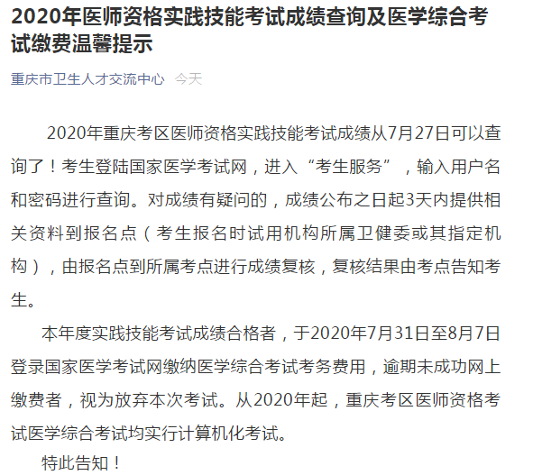本年度實踐技能考試成績合格者,于2020年7月31日至8月7日登錄國家醫(yī)學(xué)考試網(wǎng)繳納醫(yī)學(xué)綜合考試考務(wù)費用,逾期未成功網(wǎng)上繳費者,視為放棄本次考試。從2020年起,重慶考區(qū)醫(yī)師資格考試醫(yī)學(xué)綜合考試均實行計算機(jī)化考試。
