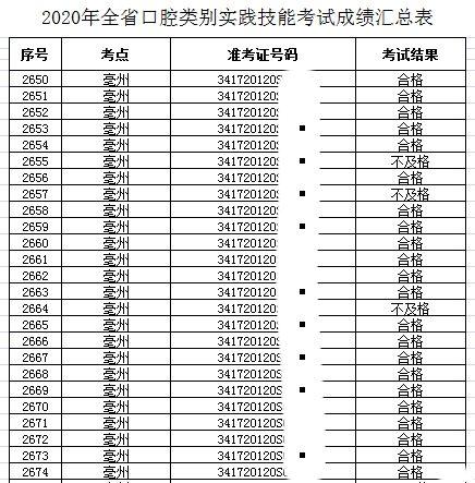 亳州考點2020年口腔執(zhí)業(yè)醫(yī)師實踐技能考試成績結(jié)果一覽表