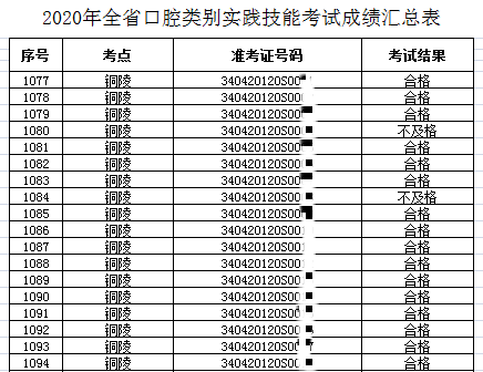 安徽銅陵市2020年醫(yī)師資格實(shí)踐技能考試(口腔執(zhí)業(yè))成績單!