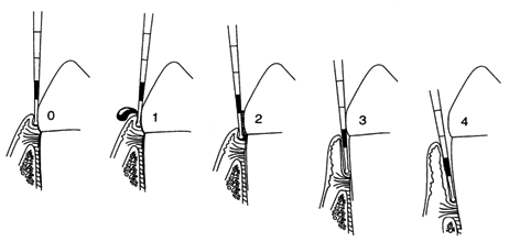 4=晚期牙周病,探針黑色部分被齦緣完全覆蓋,牙周袋深度6mm或以上