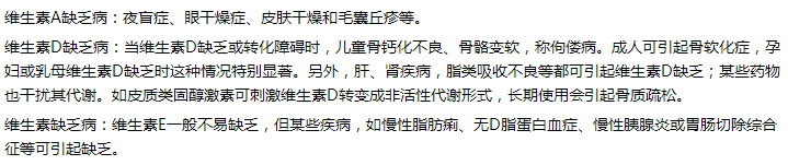維生素K缺乏?。壕S生素K的正常需要量為每日60——80μg。缺乏時,表現(xiàn)為凝血因子合成障礙,凝血時間延長,易出血。維生素K分布廣泛,人體腸道細(xì)菌又能合成,故一般不會缺乏,但脂質(zhì)吸收障礙或長期使用抗生素,可引起維生素K缺乏。