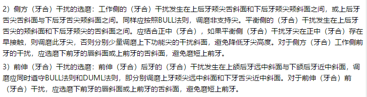 1)正中(牙合)早接觸的選磨:正中(牙合)早接觸可分為支持尖早接觸和非支持尖早接觸。對于上牙頰尖和下牙或下牙舌尖與上牙的早接觸,應按照BULL法則,調磨非支持尖,即調磨上后牙頰尖和下后牙舌尖。對于支持尖早接觸,即上牙舌尖或下牙頰尖分別與對(牙合)牙中央窩和近遠中邊緣嵴之間的早接觸,應結合側方(牙合)平衡側接觸情況,如果正中(牙合)有早接觸的支持尖在作為平衡側時也存在(牙合)干擾,則調磨支持尖。如果作為平衡側時無(牙合)干擾,則調磨與支持尖相對的對(牙合)牙的中央窩或(牙合)邊緣嵴。