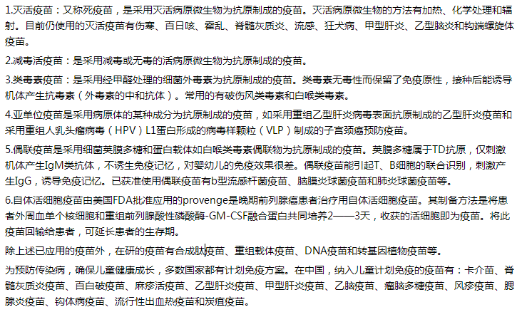 疫苗的種類及應用:疫苗是用于人工主動免疫的、含有抗原性物質(zhì)的生物制品。疫苗內(nèi)的抗原性物質(zhì)可以是減毒或滅活的病原微生物、病原微生物的毒素、表面蛋白或其類似物。疫苗內(nèi)的抗原可以刺激個體產(chǎn)生記憶性的免疫細胞。成功接種疫苗的個體在接觸到相應的病原體時可以發(fā)動快速、強效的免疫應答,遏制或摧毀該病原體。