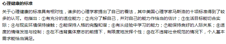 此外,我國(guó)的心理學(xué)家還從適應(yīng)能力、耐受力、控制力、意識(shí)水平、社會(huì)交往能力、康復(fù)力、愉快勝于痛苦的道德感等方面闡述了心理健康的標(biāo)準(zhǔn)。