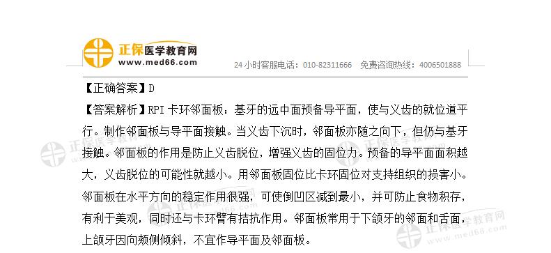 【答案解析】卡環(huán)臂:為卡環(huán)的游離部分,富有彈性,環(huán)繞基牙??ōh(huán)臂尖位于倒凹區(qū),是卡環(huán)產(chǎn)生固位作用的部分,可防止義齒(牙合)向脫位??ōh(huán)臂起始部分較堅(jiān)硬,放置在觀測線上或非倒凹區(qū),起穩(wěn)定作用,防止義齒側(cè)向移位。