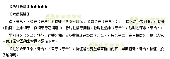本講中混(牙合)(替牙(牙合))特征是需要重點(diǎn)掌握的內(nèi)容,早期恒牙(牙合)特征一般了解即可。為幫助大家掌握相關(guān)考點(diǎn),下面將“替牙(牙合)特征及早期恒牙(牙合)特征——口腔執(zhí)業(yè)醫(yī)師輔導(dǎo)筆記”分享給大家,具體如下: