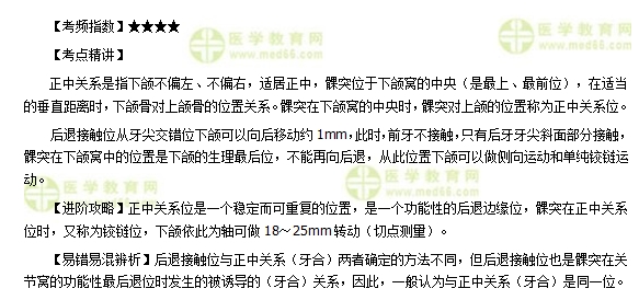 此講內(nèi)容易錯易混辨析:后退接觸位與正中關(guān)系(牙合)兩者確定的方法不同,但后退接觸位也是髁突在關(guān)節(jié)窩的功能性最后退位時發(fā)生的被誘導(dǎo)的(牙合)關(guān)系,因此,一般認為與正中關(guān)系(牙合)是同一位。下面將“正中關(guān)系位、后退接觸位——口腔執(zhí)業(yè)醫(yī)師章節(jié)高頻考點”分享給大家,具體如下:
