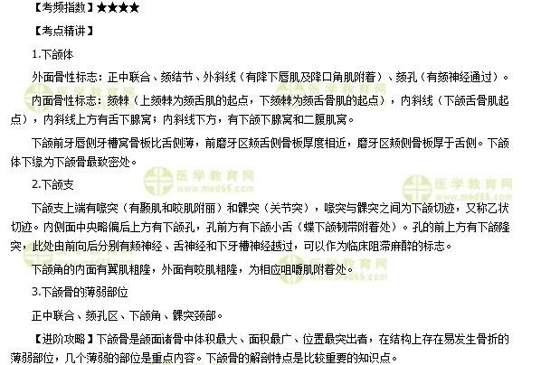 下頜骨是頜面諸骨中體積最大、面積最廣、位置最突出者,在結構上存在易發(fā)生骨折的薄弱部位,幾個薄弱的部位是重點內容。下頜骨的解剖特點是比較重要的知識點。下面將相關知識點及試題測試解析整理成文章“口腔執(zhí)業(yè)醫(yī)師章節(jié)考試要點梳理:下頜骨解剖特點”分享如下: