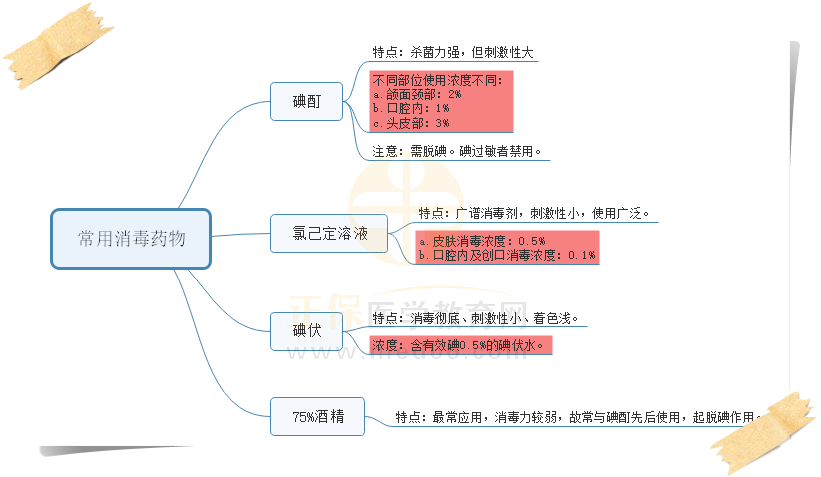 口腔執(zhí)業(yè)醫(yī)師考試各科目緊密關(guān)聯(lián),考點環(huán)環(huán)相扣,一不留神,就容易思維混亂,考點混淆。解決這一問題,最好的辦法就是制作思維導圖,從宏觀上理清知識要點,然后從微觀上查漏補缺。下面是口腔頜面外科學:手術(shù)區(qū)常用消毒藥物的思維導圖。