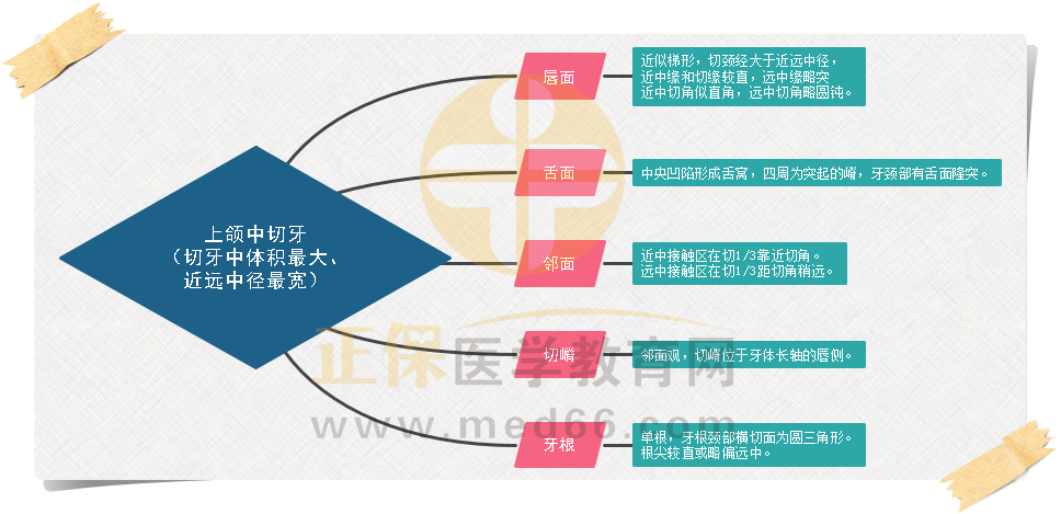 口腔執(zhí)業(yè)醫(yī)師考試各科目緊密關(guān)聯(lián),考點(diǎn)環(huán)環(huán)相扣,一不留神,就容易思維混亂,考點(diǎn)混淆。解決這一問題,最好的辦法就是制作思維導(dǎo)圖,從宏觀上理清知識(shí)要點(diǎn),然后從微觀上查漏補(bǔ)缺。下面是上頜中切牙考點(diǎn)總結(jié)(切牙中體積最大、近遠(yuǎn)中徑最寬)。