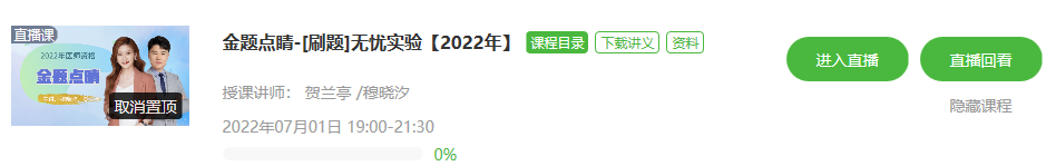 從醫(yī)學(xué)教育網(wǎng)首頁進入“我的網(wǎng)校我的家”-“我的課程”-“進入學(xué)習(xí)”-“直播”-金題點睛,直播前開放直播入口;
