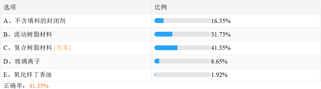 關(guān)于“對于C類型的預(yù)防性樹脂充填,應(yīng)該使用的修復(fù)材料為?”,相信很多正在備戰(zhàn)2023年口腔執(zhí)業(yè)醫(yī)師考試的考生十分關(guān)注,此題在摸底測試50題(點(diǎn)擊參加測試>>)中正確率僅為41.35%,建議大家及時復(fù)習(xí),牢固掌握相關(guān)知識點(diǎn)!