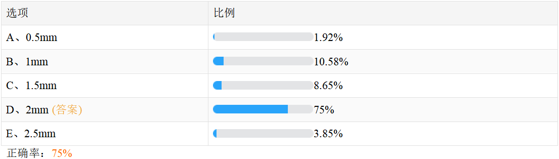 關(guān)于“可摘局部義齒塑料基托的厚度一般為?”,相信很多正在備戰(zhàn)2023年口腔執(zhí)業(yè)醫(yī)師考試的考生十分關(guān)注,此題在摸底測(cè)試50題(點(diǎn)擊參加測(cè)試>>)中正確率僅為75%,建議大家及時(shí)復(fù)習(xí),牢固掌握相關(guān)知識(shí)點(diǎn)!