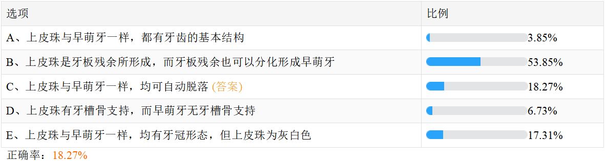 關(guān)于“關(guān)于乳牙的早萌牙與“上皮珠”的鑒別,下列說法正確的是?”,相信很多正在備戰(zhàn)2023年口腔執(zhí)業(yè)醫(yī)師考試的考生十分關(guān)注,此題在摸底測試50題(點(diǎn)擊參加測試>>)中正確率僅為18.27%,建議大家及時(shí)復(fù)習(xí),牢固掌握相關(guān)知識(shí)點(diǎn)!