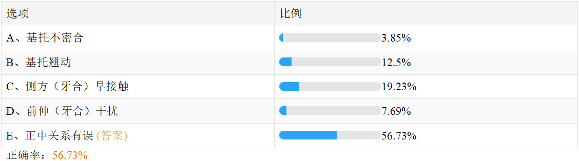 10.一患者戴用全口義齒1周,主訴咬合疼痛,定位不明確。檢查:黏膜未見紅腫或潰瘍部位,基托邊緣伸展合適,做正中(牙合)咬合時(shí),上頜義齒有明顯扭轉(zhuǎn),問題是