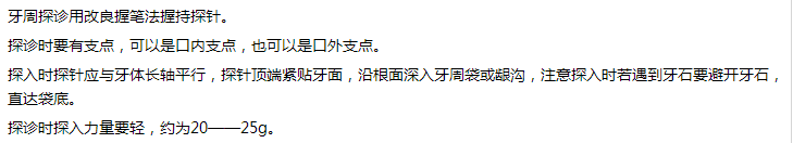 牙周探診使用的器械為牙周探針,其頂端為鈍頭,頂端直徑約0.5mm,探針上有刻度。根面牙石的探查和根分叉病變的探查使用普通探針。