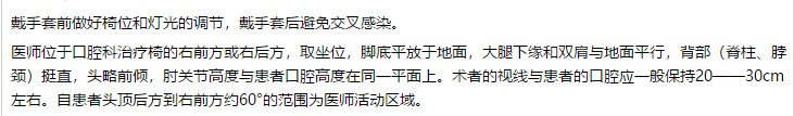 患者體位:調(diào)節(jié)治療椅,患者仰臥位,頭部與醫(yī)師肘部平行,檢查上頜牙時,患者咬合平面與地面成45°——90°角,檢查下頜牙時,咬合平面盡量與地面平行。