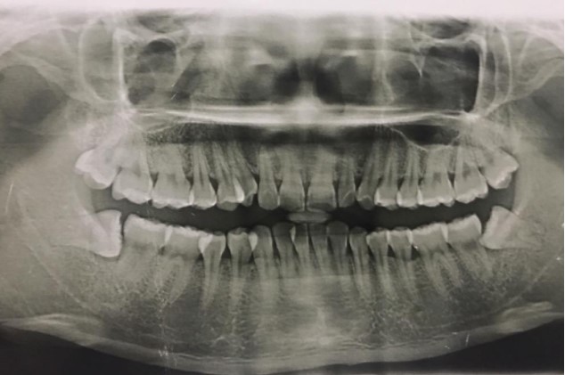 患者,男,38歲。上前牙變色1年,自述上前牙5年前受過外傷,唇側(cè)傾斜,檢查可見左上1牙冠變色,牙冠缺損近1/2,牙髓測試無反應(yīng),X線根尖片顯示患牙無明顯異常,全景片顯示雙側(cè)下頜智齒近中阻生,之前有發(fā)炎化膿病史,目前無咀嚼不適??谇黄溆酂o異常。