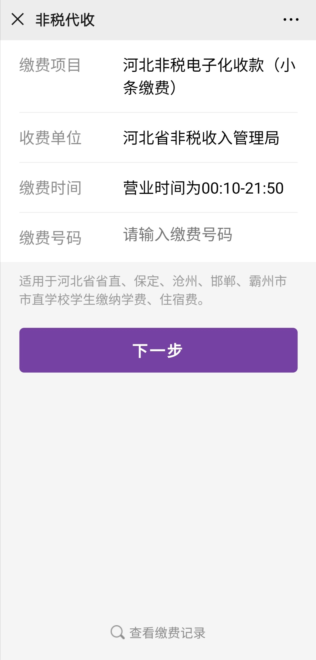 第二步:掃描下圖二維碼,將復(fù)制好的繳費號碼粘貼在繳費號碼處,點擊下一步,根據(jù)提示核實繳費信息并完成繳費。
