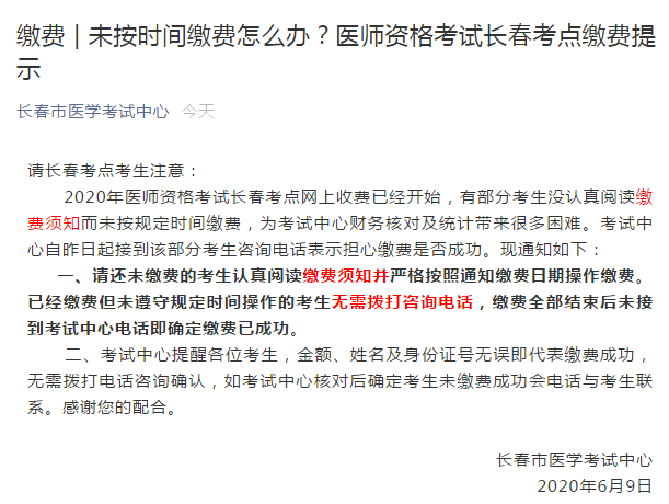 繳費(fèi)須知、繳費(fèi)時(shí)間和流程說明:長春考點(diǎn)關(guān)于繳納2020年國家醫(yī)師資格考試費(fèi)用的通知