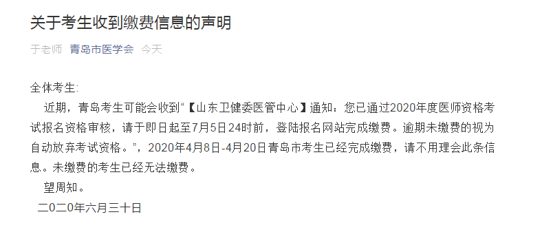 青島考點關(guān)于2020口腔執(zhí)業(yè)醫(yī)師考生收到繳費信息的聲明