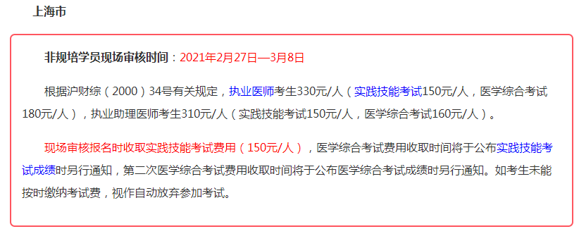 現(xiàn)場(chǎng)審核報(bào)名時(shí)(非規(guī)培學(xué)員現(xiàn)場(chǎng)審核時(shí)間:2021年2月27日—3月8日)收取實(shí)踐技能考試費(fèi)用(150元/人),醫(yī)學(xué)綜合考試費(fèi)用收取時(shí)間將于公布實(shí)踐技能考試成績(jī)時(shí)另行通知,第二次醫(yī)學(xué)綜合考試費(fèi)用收取時(shí)間將于公布醫(yī)學(xué)綜合考試成績(jī)時(shí)另行通知。如考生未能按時(shí)繳納考試費(fèi),視作自動(dòng)放棄參加考試。