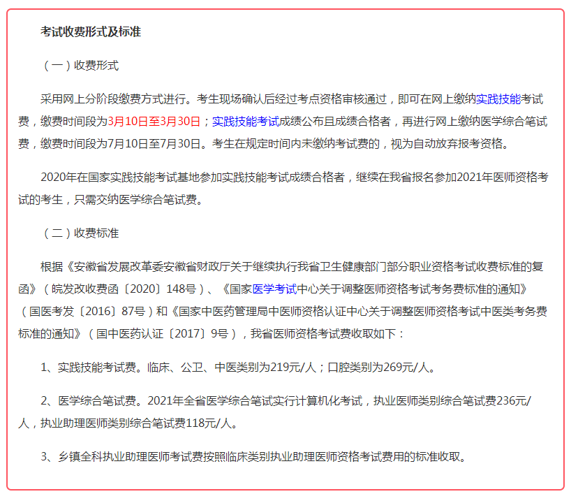 根據(jù)《安徽省發(fā)展改革委安徽省財(cái)政廳關(guān)于繼續(xù)執(zhí)行我省衛(wèi)生健康部門部分職業(yè)資格考試收費(fèi)標(biāo)準(zhǔn)的復(fù)函》(皖發(fā)改收費(fèi)函〔2020〕148號(hào))、《國(guó)家醫(yī)學(xué)考試中心關(guān)于調(diào)整醫(yī)師資格考試考務(wù)費(fèi)標(biāo)準(zhǔn)的通知》(國(guó)醫(yī)考發(fā)〔2016〕87號(hào))和《國(guó)家中醫(yī)藥管理局中醫(yī)師資格認(rèn)證中心關(guān)于調(diào)整醫(yī)師資格考試中醫(yī)類考務(wù)費(fèi)標(biāo)準(zhǔn)的通知》(國(guó)中醫(yī)藥認(rèn)證〔2017〕9號(hào)),我省醫(yī)師資格考試費(fèi)收取如下: